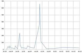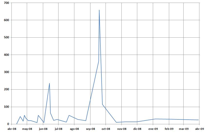 Gráfico de la media de páginas por día en la wiki del Ateneo de Córdoba en el periodo 2008-2009 |