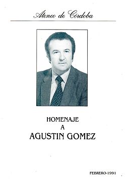 Por acuerdo de la Asamblea General Constituyente del Ateneo de Córdoba de 16 de marzo de 1990, se rinde homenaje a D. Agustín Gómez Pérez el día 8 de marzo de 1991 en un acto flamenco multitudinario cuyos asistentes, de Córdoba y provincia, abarrotan el Salón de Actos del Palacio de la Merced y dependencias anejas. Presiden el Diputado delegado de Cultura Juan Luis Valenzuela Simón y el presidente del Ateneo. Tras la lectura de su nombramiento como Ateneista de Honor, se procede a la presentación del libro El flamenco es vida de Agustín Gómez (núm. 1 de la col. Arca del Ateneo, edición de Manuel Gahete Jurado, portada de Antonio Povedano, prólogo de Francisco Solano Márquez e ilustraciones interiores de Antonio Bujalance, Jacinto Lara, Juan Hidalgo del Moral y Venancio Blanco.