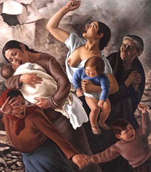 En 1937 participa en el concurso de carteles que se celebra en la Plaza Mayor de Madrid con el lema “El levantamiento fascista del 18 de julio”. Pinta su lienzo Aviones negros (Madrid 1937) para el Pabellón de la República Española en la Exposición Internacional de París de ese año, siendo una de las obras más admiradas del conjunto. Realiza su otro gran cuadro de guerra, Éxodo, para el Concurso de Pintura, Escultura, Grabado y Dibujo que convoca en septiembre el Ministerio de Instrucción Pública. Empieza a colaborar en 14ª División. Semanario del Frente, CNT, Frente Libertario y Victoria. Revista de la División 42.